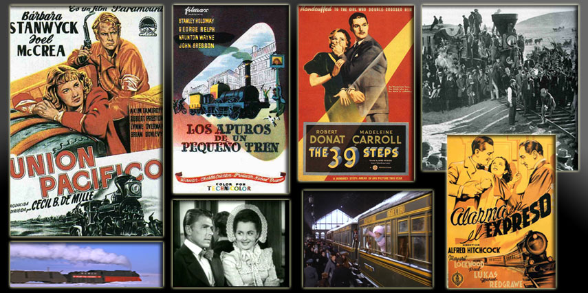 39 ESCALONES (1935) es uno de los títulos más conocidos de la etapa inglesa de Alfred Hitchcock, y contiene secuencias de especial interés ferroviario como la del paso del tren por un magnífico puente metálico. Otros títulos valiosos del genio inglés son ALARMA EN EL EXPRESO (1938), EXTRAÑOS EN UN TREN (1951) y LA SOMBRA DE UNA DUDA (1943). Mención especial para otro de sus clásicos: CON LA MUERTE EN LOS TALONES (North by Northwest, 1959). Cary Grant en su desesperada huída toma el tren de Nueva York a Chicago sin pasar por taquilla y claro, no le queda otro remedio que compartir coche cama con Eva Marie Saint, otra "femme fatale" rubia y peligrosa de las que tanto gustaba rodearse el maestro del suspense.